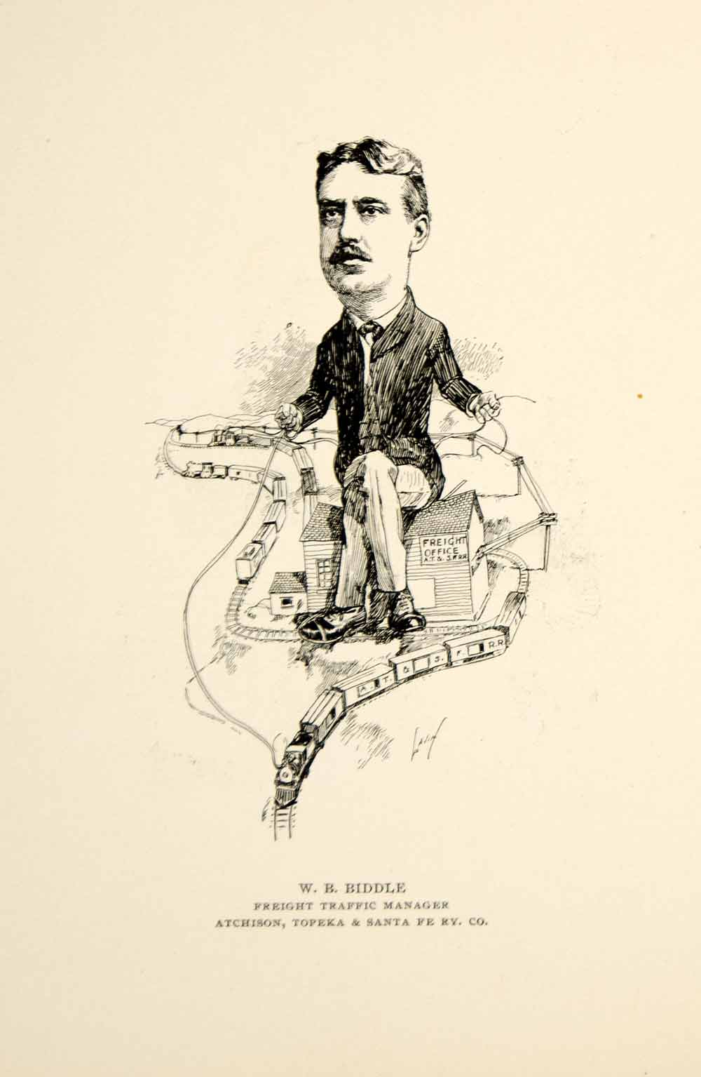 This is an original 1904 black and white in-text lithograph illustrated by D.J. Lavin of W.B. Biddle, the Freight Traffic Manager for the Atchinson, Topeka, and Santa Fe Railroad.