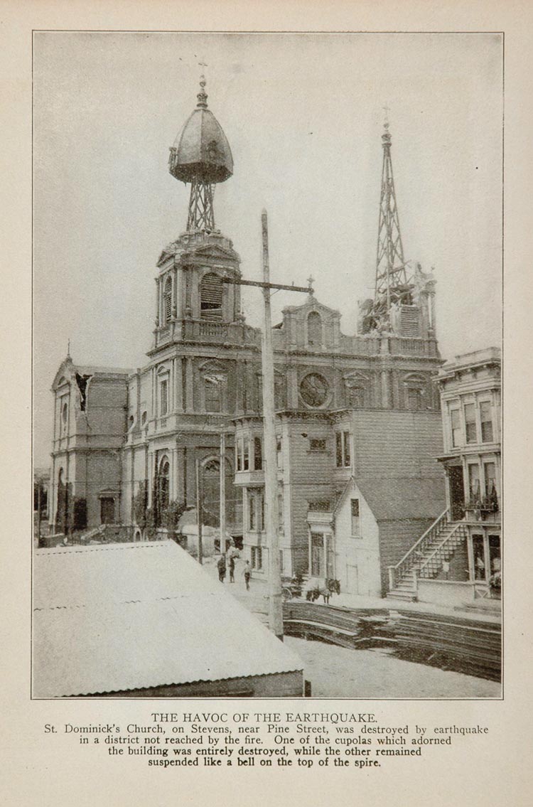 “The Havoc of the Earthquake.” This image shows St. Dominick’s Church on Stevens, near Pine Street, which was destroyed by the earthquake.