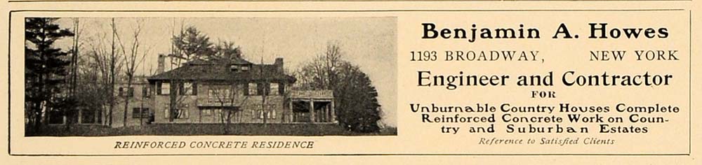 This is an original 1907 black and white print ad for Benjamin A. Howes, Engineer and Contractor for Unburnable Country Houses and Complete Reinforced Concrete Work on Country and Suburban Estates.