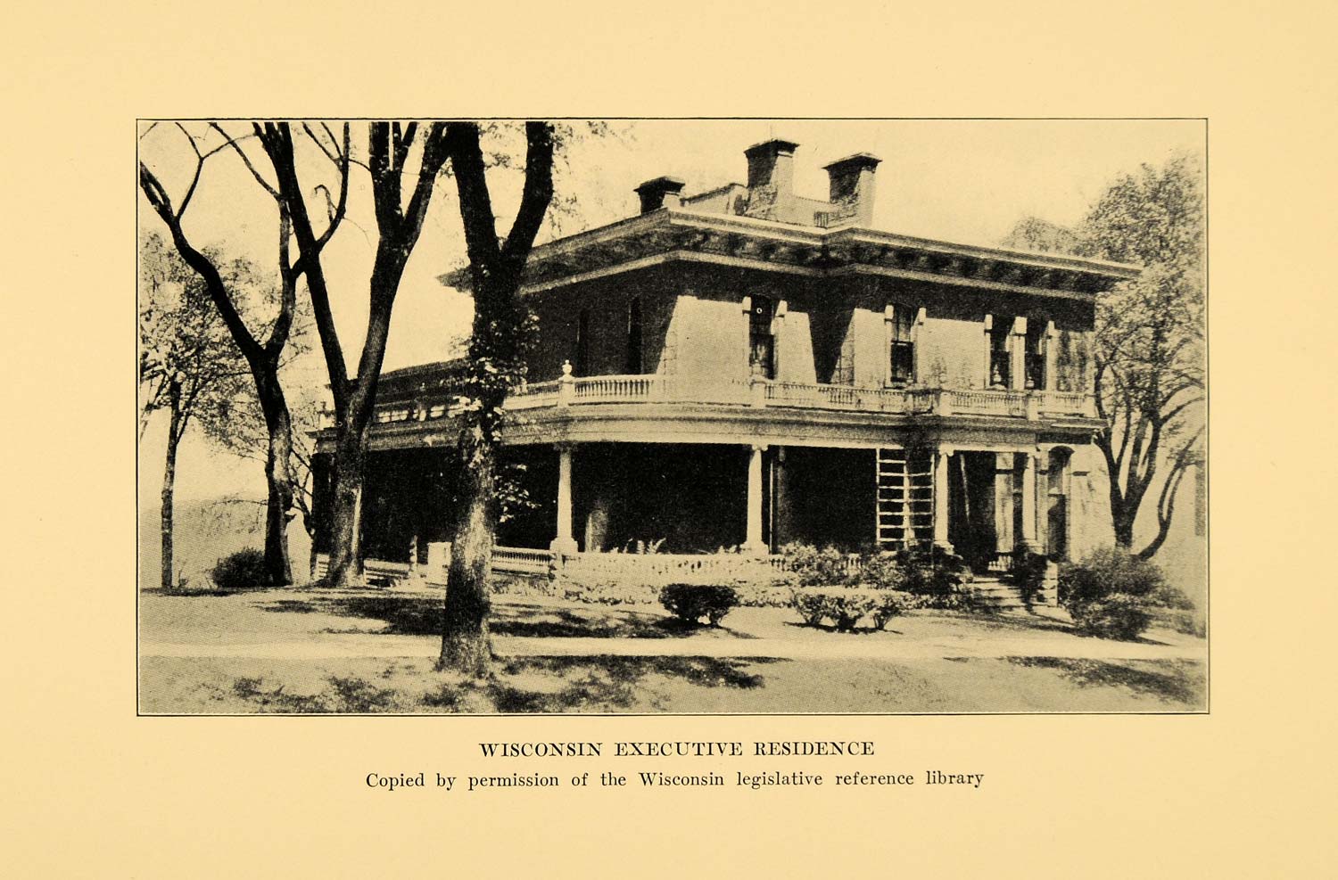 This is an original 1937 halftone print featuring an image of the Wisconsin Executive Residence in the city of Madison, Dane County, Wisconsin. This item was copied by permission of the Wisconsin legislative reference library.