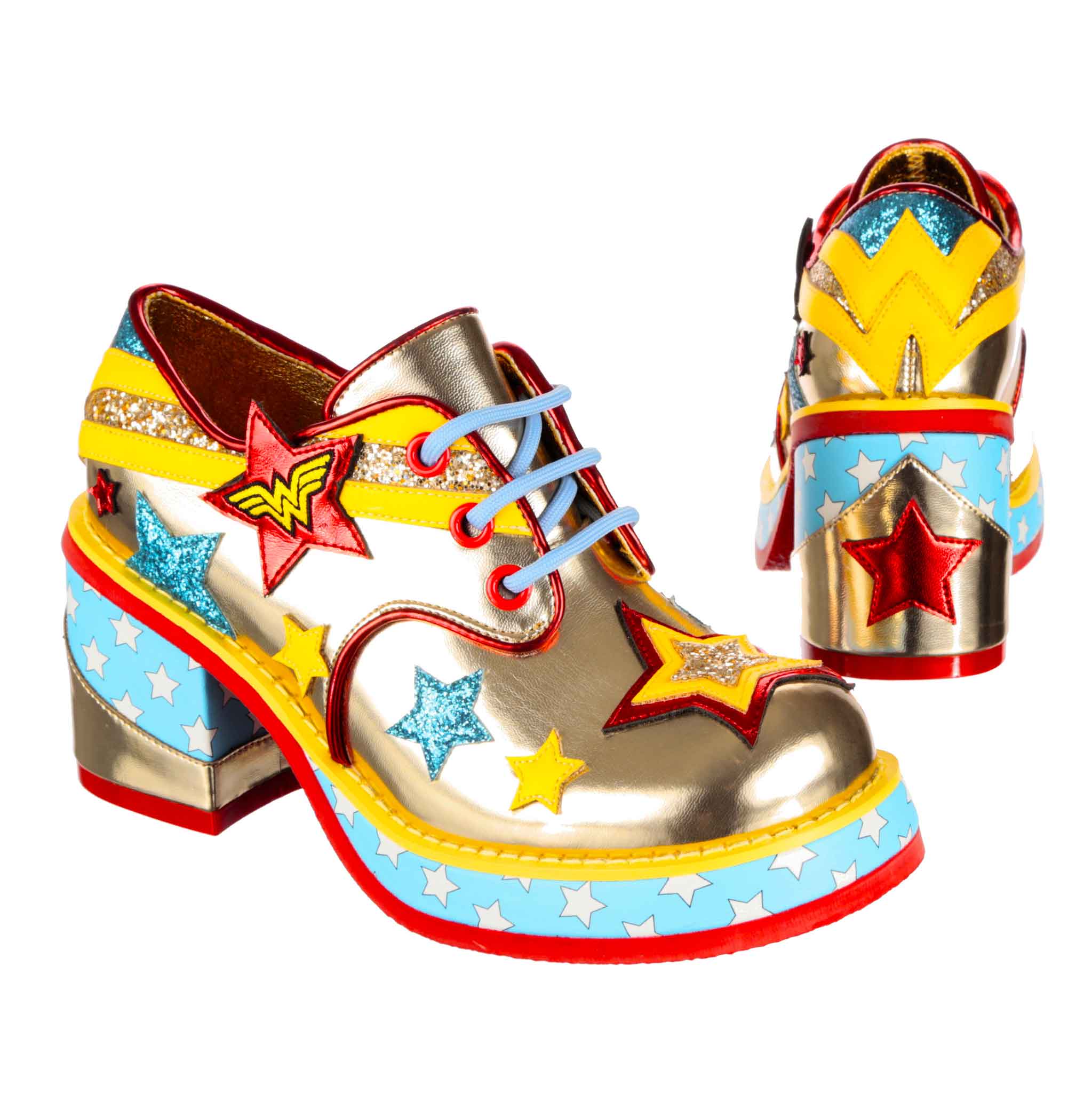 These wondrous 70s inspired chunky platforms are giving us all the BAM! POW! superhero feelings. These Wonder Woman inspired gold shoes are covered from heel to toe in yellow, blue, and red sparkling applique stars, and the heel design echoes Wonder Woman’s iconic tiara and breastplate in it’s detailing. Featuring a chunky platform and mid heel height, this style are super wearable with a generous fit and cute laces to finish.
