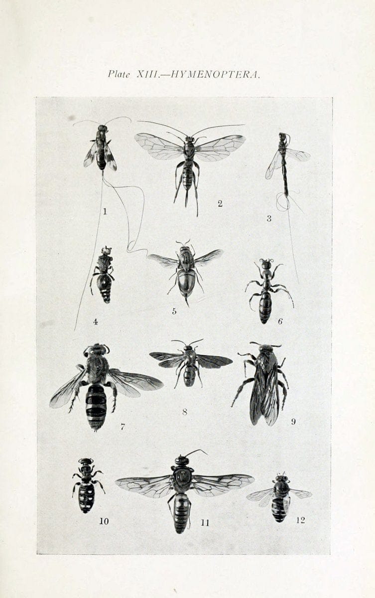 Australian insects..Sydney,W. Brooks[1907].||Hymenoptera geo:country=Australia Megalyridae Ichneumonidae Evaniidae Mutillidae Chrysididae Thynnidae Scoliidae Sphegidae “Megalyra fasciipennis” “taxonomy:binomial=Megalyra fasciipennis” “Pimpla intricatoria” Gasteruption “Mutilla formicaria” “Stilbum splendidum” “Diamma bicolor” “Thynnus variabilis” “Trielus zonata” “Discolia verticalis” “taxonomy:binomial=Discolia verticalis” “Discolia soror” “taxonomy:binomial=Discolia soror” “Bembex tridentifera” “taxonomy:binomial=Bembex tridentifera” “Bembix palmata” “taxonomy:binomial=Bembix palmata” arthropoda