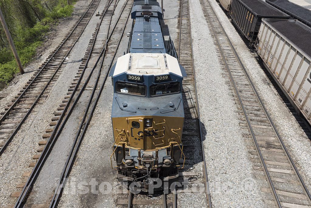 A diesel locomotive passes along what were once bustling passenger rail lines of the Baltimore & Ohio Railroad as well in Grafton, West Virginia, which was an early B&O hub